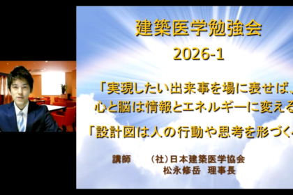 お知らせ <ご報告>11月26日(水)建築医学勉強会を開催しました ~住宅ローンを含むお金の流れと運用方法について~ <ご報告>10月25日(土)建築医学講演会&シンポジウムを開催しました <ご報告>8月27日(水)建築医学勉強会を開催しました 「音が人間の心身に与える影響について」 <ご報告>2025年7月 建築医学勉強会を開催しました <ご報告>5月28日(水) 建築医学勉強会を開催しました ~電磁波が人間の心身に与える影響について~ 10月25日 (土) 建築医学講演会&シンポジウムを開催しました健やかないのち育む環境を創造する健築医学 日本建築医学協会を一般社団法人に改組し、新しい一歩を踏み出すにあたり、わたしたちは真剣な議論を重ね「建築医学の使命とは何か」を問い直しました。 健やかないのち育む環境を創造する。 そのための新しい医学が「建築医学」である。 それがわたしたちの、今の熱い想いです。 医学は、長い歴史と伝統を持ち、高い倫理性を要求される、高度に専門的な学問領域です。 わたしたちの「建築医学」は、そこに現れた新しい息吹です。 「建物のあり方」「都市のあり方」「住まい方」に対する、確かな医学的エビデンスを集積すること。 それらに基づき、社会に信頼される未来への提言を行うこと。 これが、わたしたちの責務です。 いのちに関わる責任の重大さを厳しく自覚しつつ、勇気ある一歩を、皆様とともにここに印したいと決意しています。