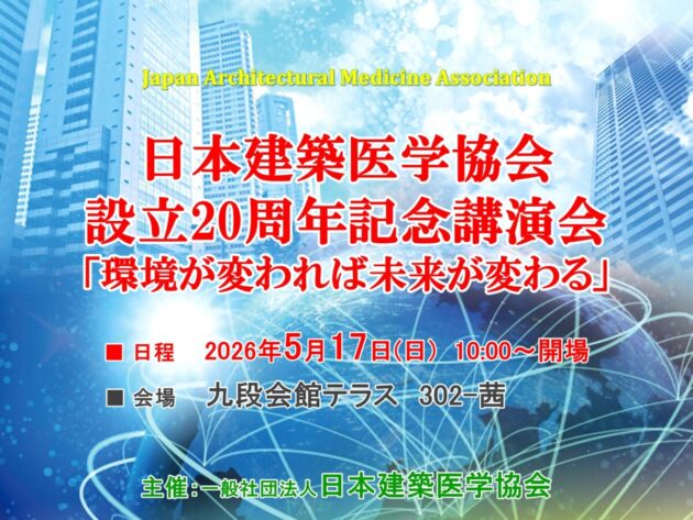 お知らせ <ご案内>5月17日 (日) 日本建築医学協会 設立20周年記念講演会 <ご報告> 1月28日(水) 建築医学勉強会を開催しました~ 実現したい出来事を場に表せば、心と脳は情報をエネルギーに変える~ <ご報告>11月26日(水)建築医学勉強会を開催しました ~住宅ローンを含むお金の流れと運用方法について~ <ご報告>10月25日(土)建築医学講演会&シンポジウムを開催しました <ご報告>8月27日(水)建築医学勉強会を開催しました 「音が人間の心身に与える影響について」 5月17日 (日) 日本建築医学協会 設立20周年記念講演会健やかないのち育む環境を創造する健築医学 日本建築医学協会を一般社団法人に改組し、新しい一歩を踏み出すにあたり、わたしたちは真剣な議論を重ね「建築医学の使命とは何か」を問い直しました。 健やかないのち育む環境を創造する。 そのための新しい医学が「建築医学」である。 それがわたしたちの、今の熱い想いです。 医学は、長い歴史と伝統を持ち、高い倫理性を要求される、高度に専門的な学問領域です。 わたしたちの「建築医学」は、そこに現れた新しい息吹です。 「建物のあり方」「都市のあり方」「住まい方」に対する、確かな医学的エビデンスを集積すること。 それらに基づき、社会に信頼される未来への提言を行うこと。 これが、わたしたちの責務です。 いのちに関わる責任の重大さを厳しく自覚しつつ、勇気ある一歩を、皆様とともにここに印したいと決意しています。